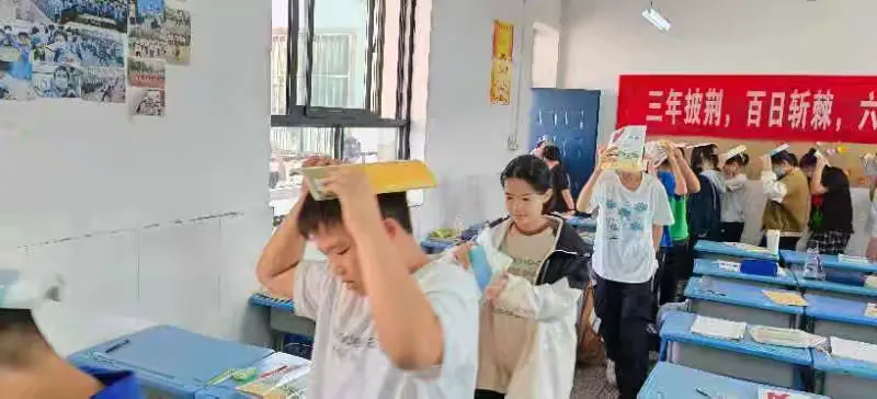 随着第一声警报声的响起,地震演练正式开始。教室里,老师们迅速反应,立即指挥学生们进行紧急避险。学生们双手抱头,迅速躲到课桌下,身体紧紧蜷缩,尽可能地保护自己的要害部位。他们神情紧张而专注,严格按照老师的指示行动。短暂的避险之后,警报再次响起,学生们在老师的带领下,按照预定的疏散路线,快速、有序地撤离到安全地带。他们用书本护住头部,弯腰低姿前行,队伍整齐而不慌乱。到达集结点各班班长清点人数,并向安全员汇报班级情况。